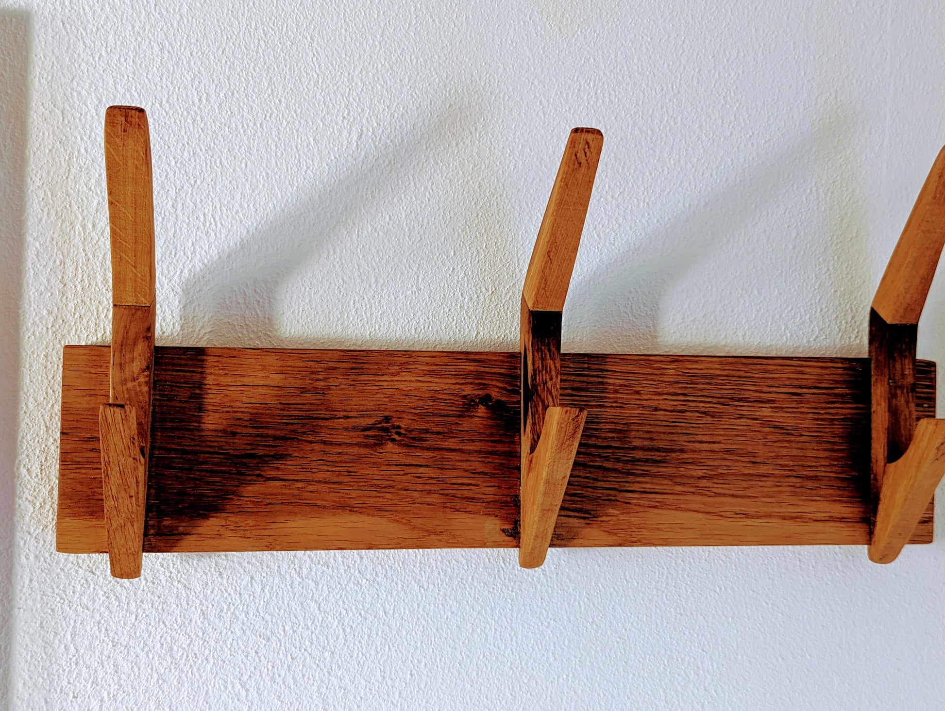 This wall-mounted coat rack is a sculptural interpretation of everyday utility. Handcrafted from a reclaimed oak beam, each element of its design emphasizes balance, proportion, and the tactile warmth of aged wood. The angular hooks emerge seamlessly from the solid backplate, creating a dynamic play of lines and shadows.